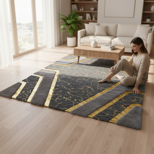 1.5 x 2m 3D Marble Design Carpet Black & Gold