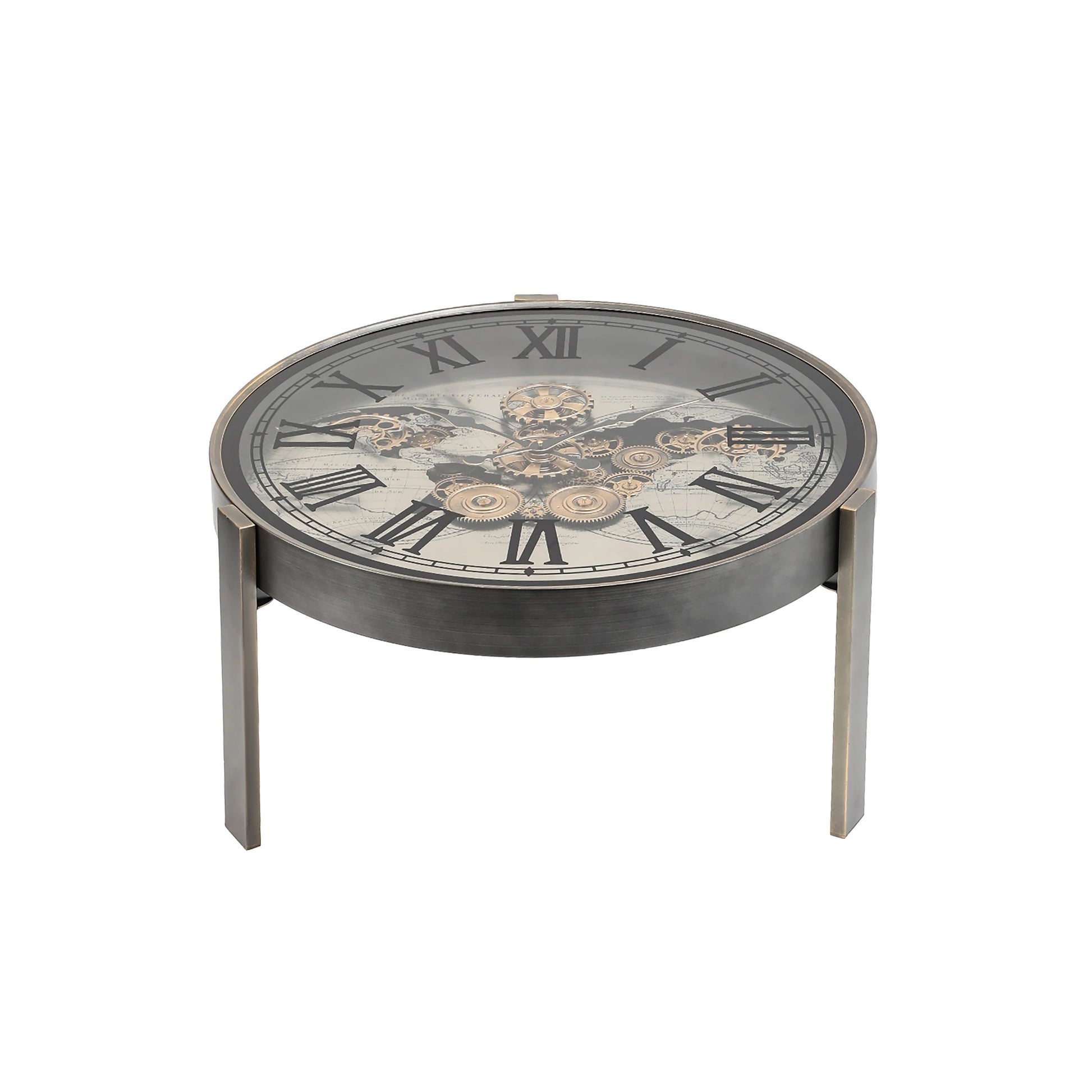 Dual-purpose design meets vintage charm with this striking timepiece. By day, it's a functional side table; by night, it transforms into a statement floor clock. The mesmerizing moving gears and antique map detailing create an ever-changing focal point that sparks conversation. Crafted in sleek silver, it blends steampunk aesthetics with practical home décor. Perfect for collectors who refuse to choose between form and function—this clock does both with flair.
